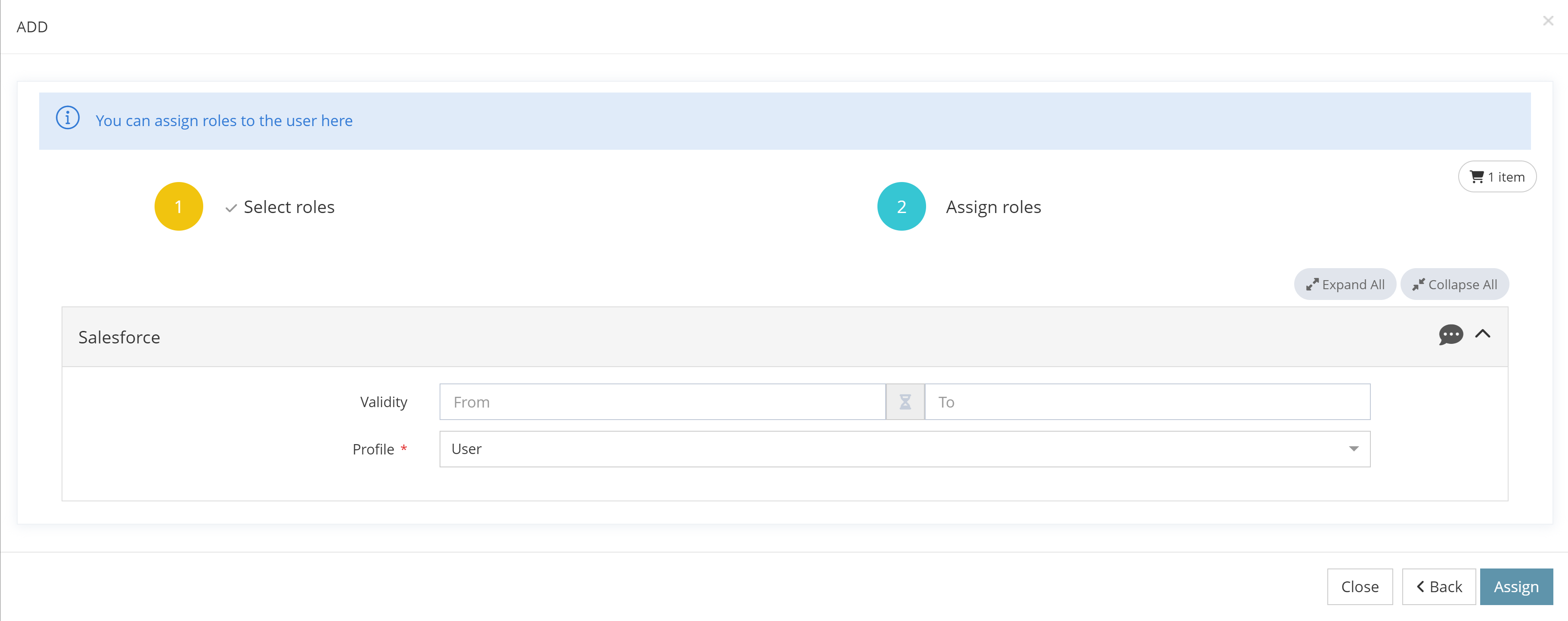 Let’s revisit our previous example with its 100 Salesforce roles: dimensions drastically simplify the role model by reducing it to a single “Salesforce” role with two dimensions – “Profile” and “License.” For each role assignment to a user, you can choose the user’s profile and license from a list.